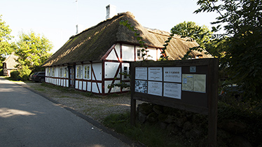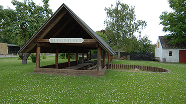 I Huggehuset, som i dag står overfor Dalby Kirke, er der mulighed for at tage et hvil og sidde for at spise under det beskyttende tag. |